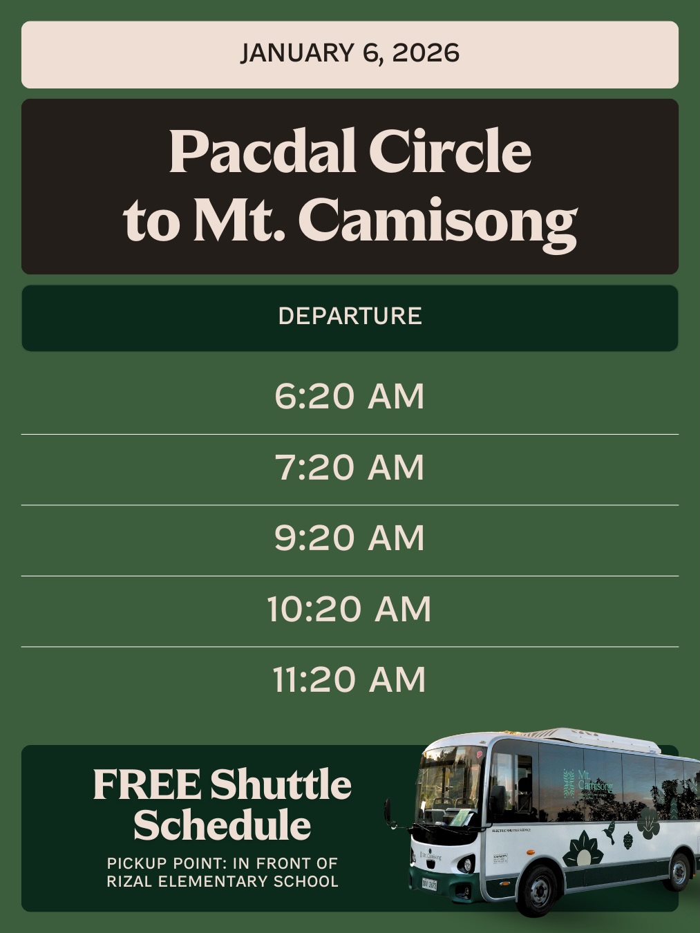 At the moment, we don’t offer overnight accommodations. Mt. Camisong is a day-use nature retreat, perfect for daytime visits and scenic experiences.